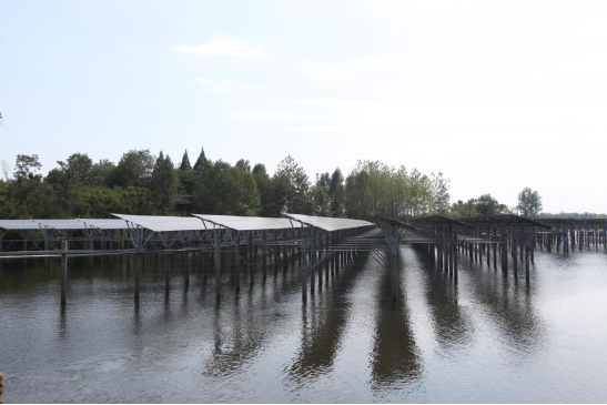 桃源湘成光伏电站由桃源县湘成光伏电力有限公司投资建设,,,,,,电站位于湖南省桃源县,,,,,,装机容量40MW,,,,,,占地面积为1300亩,,,,,,为公司首个渔光互补光伏电站。。。。。。。。电站于2017 年开工建设,,,,,,同年6月建成并网投运,,,,,,该电站是公司首个接纳双玻组件的电站,为后续再水面或湿润情形的组件手艺选择涤讪了手艺基础。。。。。。。。