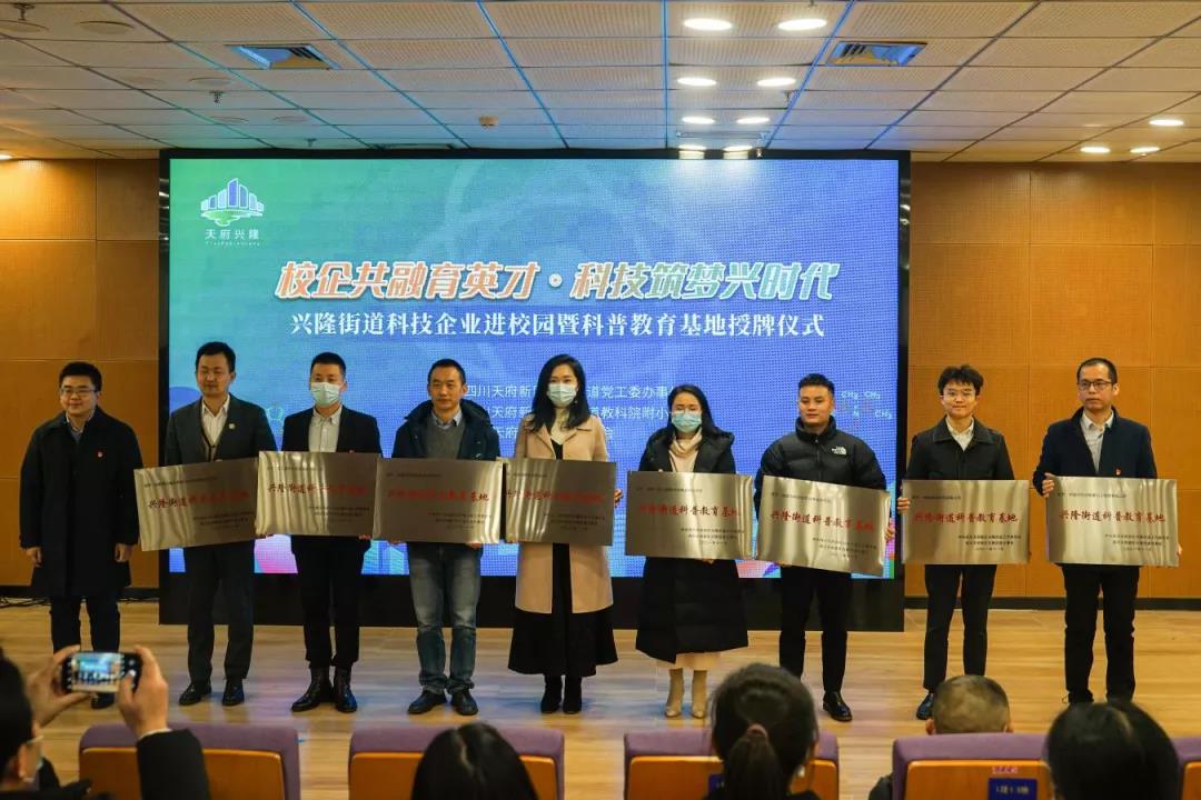 12月17日,,,,,,,,由天府新区兴隆街道主理的“校企共融育英才·科技筑梦兴时代” 兴隆街道科技企业进校园暨科普教育基地授牌仪式在四川天府新区兴隆街玄门科院附小举行,,,,,,,,兴隆街道辖区40多名企业代表、科普教育导师和10多名校院长参会。。。。。。授牌仪式上,,,,,,,,公司被授为“兴隆街道科普教育基地”,,,,,,,,2名员工被兴隆街道聘为科普教育导师。。。。。。