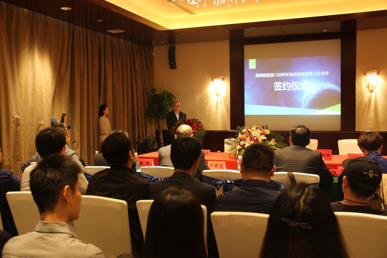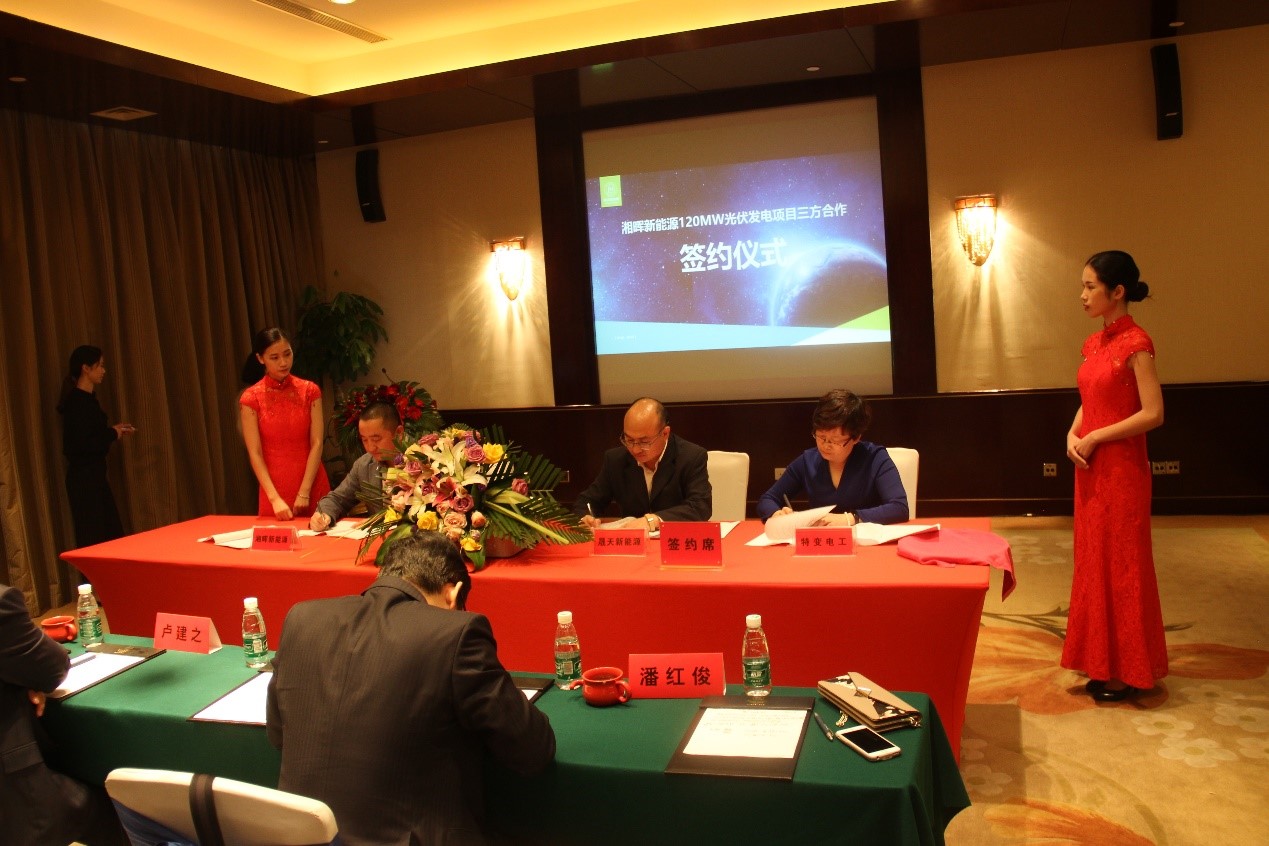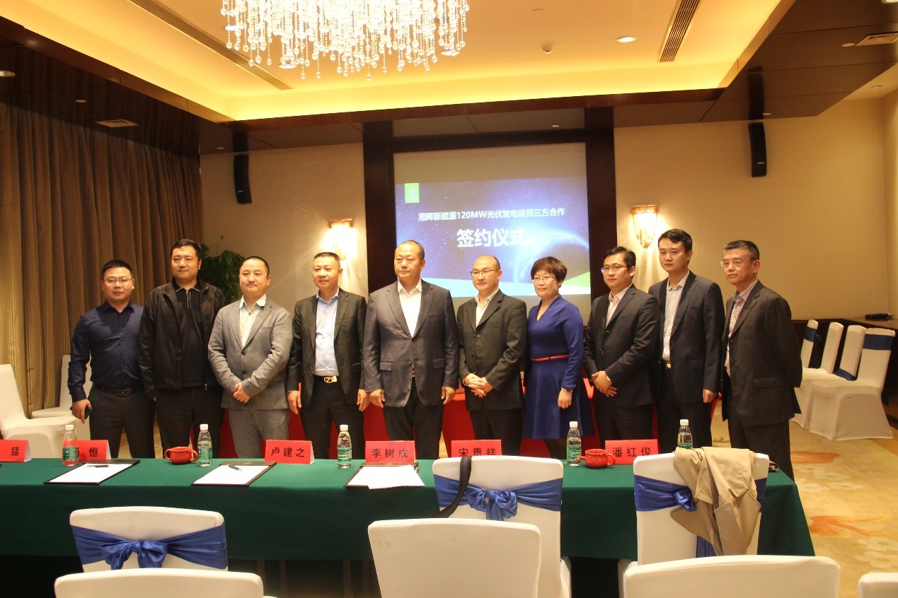 10月29日,,,,,,湖南120MW光伏发电项目三方相助签约仪式在长沙市盛大举行,,,,,,公司总司理李树成、财务总监宋贵祥,,,,,,特变电工新疆新能源副总司理潘红俊,,,,,,华民资源集团董事长卢建之,,,,,,湘晖新能源董事长熊猛、总司理张家林等向导出席仪式。。。。。