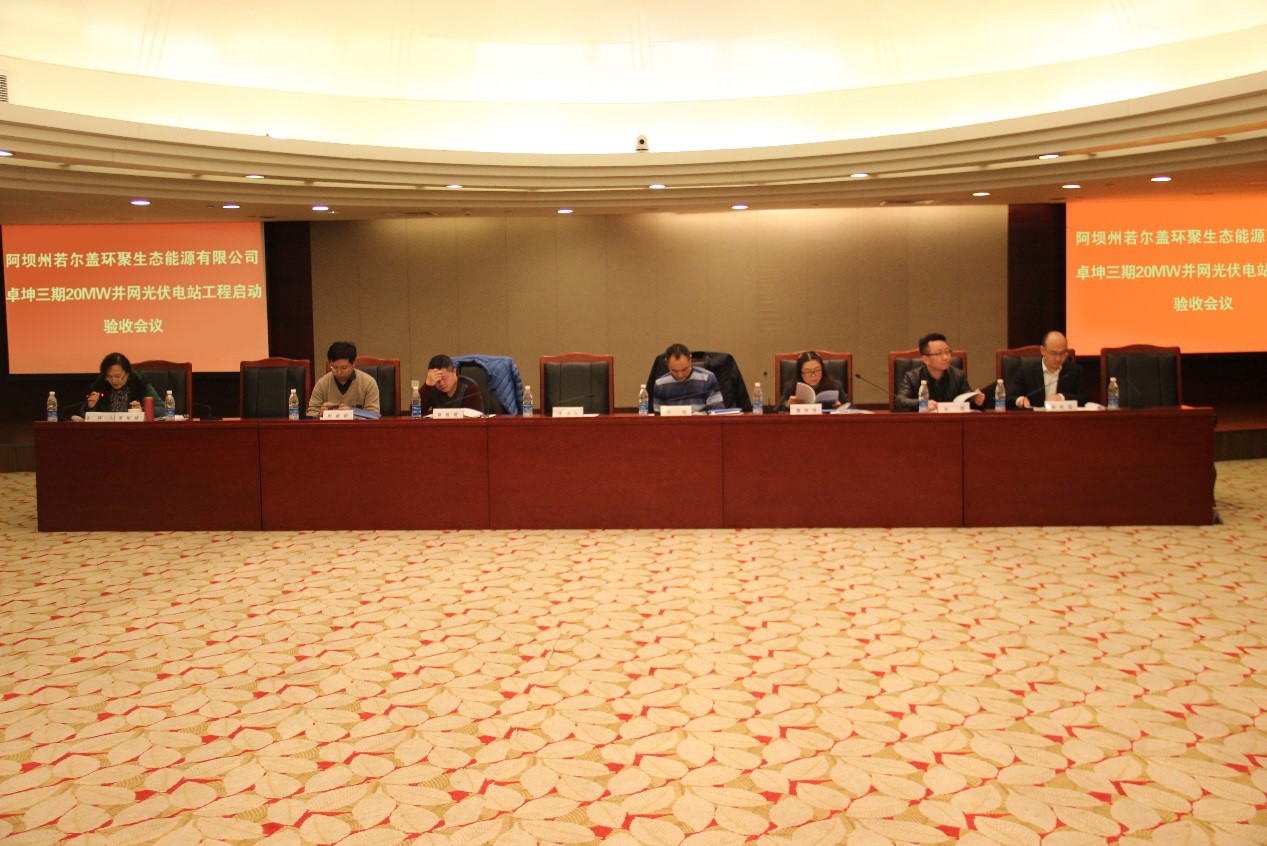 聚会由国网四川省电力公司建设部副处级调研员罗敏峰主持,,,,,,,, 省电力公司、省能源局新能源处、省经信委、省环保厅、阿坝州相关部分和若尔盖县委代表,,,,,,,,以及公司总司理李树成、常务副总江云、副总司理魏东出席了聚会。。。。。。项目设计施工单位、监理单位、调试单位、若尔盖公安消防大队、若尔盖环保局、若尔盖林业局平划分就工程完工及运行情形举行了总结汇报。。。。。。履历收委员会审议,,,,,,,,若尔盖卓坤三期20MW并网光伏电站项目完成设计文件约定内容,,,,,,,,工程资料通过验收,,,,,,,,项目质量品级均抵达优良,,,,,,,,一致赞成通过工程验收。。。。。。